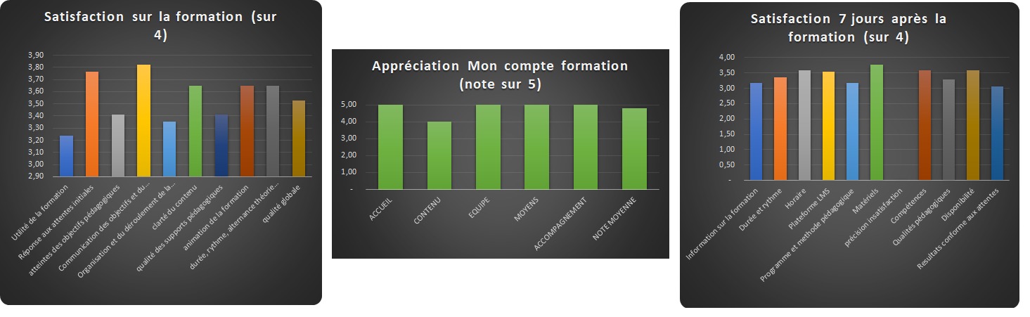 Conformément à notre démarche qualité et aux exigences du référentiel Qualiopi, nous mesurons systématiquement la satisfaction des stagiaires, à différentes étapes du parcours de formation. Voici une synthèse des résultats basée sur des questionnaires d’évaluation à chaud et via la plateforme Mon Compte Formation.